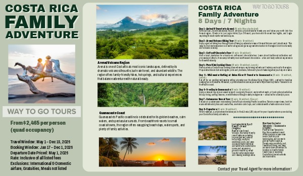 Contact your Travel Agent for more information! Your start to an incredible journey. Itineraries are fully customizable. 3 Nights Arenal Volcano at Los Lagos Hot Springs resort, 4 Nights Wynham Tamarindo Ocean View, Coffee/Chocolate Tour, Pura Vida Cooking Class, White Water Rafting, Catamaran Sunset Tour, Private destination transfers, Taxes, 7 Breakfasts, 2 lunches, 1 Dinner. From $2,465 per person (quad occupancy). Travel Window: May 1 – Dec 15, 2026. Booking Window: Jan 17 – Dec 1, 2026. Departure Date Priced: May 1, 2026. Rate: Inclusive of all listed fees Exclusions: International & Domestic airfare, Gratuities, Meals not listed